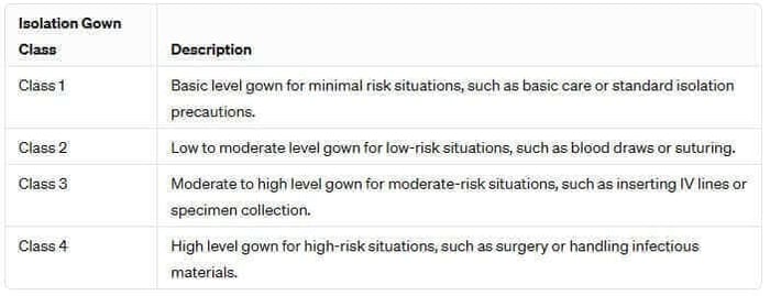 These gowns are typically offered in different classes. They're classified based on their level of protection, with AAMI Level 1 providing minimal risk coverage and AAMI Level 4 offering the highest level of protection against fluids. These classes are broken down into:
