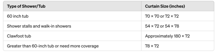 Standard shower curtain sizes for common tubs and showers: