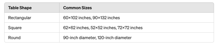 Determining the right tablecloth size is crucial for achieving a polished and put-together look. The average tablecloth size depends on the dimensions of your table and the desired drop length. A general rule of thumb is a standard overhang of at least 8". From standard rectangular tables, to circular, or oval tablecloths, finding the right fit is made simple with the comprehensive sizing options available at Direct Textile Store. See the chart we created below with the standard round, rectangular and square tablecloth dimensions to better help you in choosing the right size tablecloth based on the size of your table.