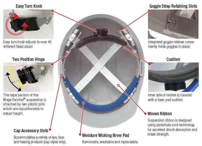 The Mega Ratchet size adjustment for head sizes 6.5 - 8 is used in Many ERB Safety Helmets (The “Secure-Fit” ratchet features an easy turn knob that allows size adjustment from head sizes 6.5 - 8 without removing the helmet. Each turn of the ratchet knob automatically locks with 50 meshing teeth securing the position. The no-slip hold maintains the desired fit even in the most physically active jobs or extreme weather conditions. The hinged ratchet fits low on the nape of the neck and is height-adjustable for a perfect fit. The ratchet mechanism is cushioned with thick sponge padding for long-lasting comfort.