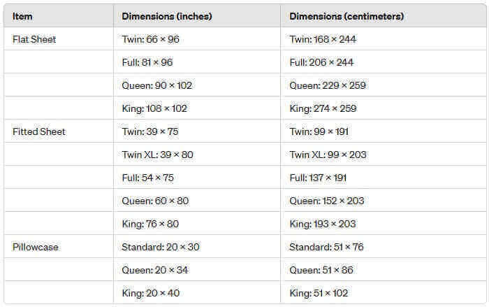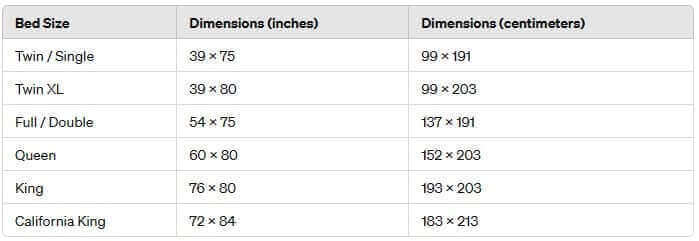 A comfortable place to sleep is one of the most important things, as sleep allows you to rest, gives you energy, and keeps your mood up. Based on age, height, and weight, the size of bed is important. Bed sizes typically are labeled as Twin/Single, Twin XL, Full/Double, Queen, King, or California King. Based on your bed size, you want to make sure to have sheets and pillowcases that size with your bed. Below is a chart of bed size and their dimensions.