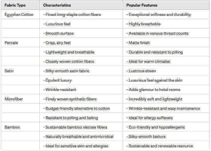 Below, is a chart of different types of Bed Sheets and their characteristics: