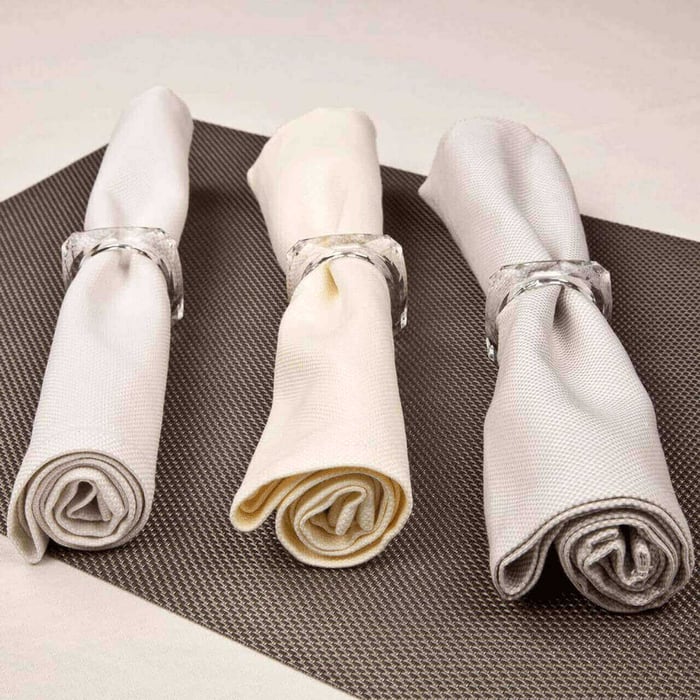 4. Napkins: Napkins are square or rectangular pieces of fabric used for wiping the mouth and hands during meals. They come in various sizes, ranging from cocktail napkins for informal gatherings to oversized dinner napkins for formal occasions. Napkins are available in a wide range of materials, including cotton, linen, polyester, and satin, each offering different levels of absorbency, softness, and durability. They can be folded in various creative ways or adorned with napkin rings, folds, or embellishments to enhance the table setting.