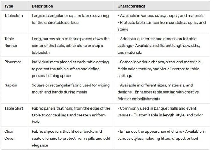 Below is a chart of the breakdown of Table Linens and their Characteristics:
