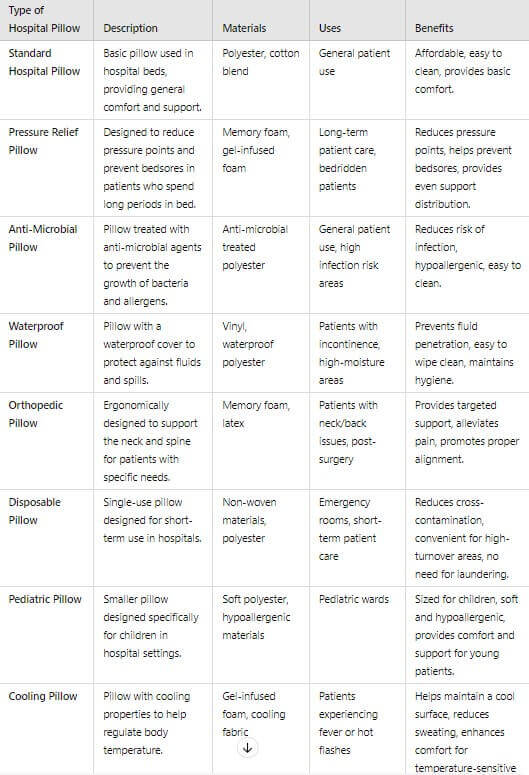 Hospital pillows offer comfort, support, and therapeutic benefits to aid in recovery and overall well-being. Below are some of the most popular pillow types for hospitals or healthcare settings: