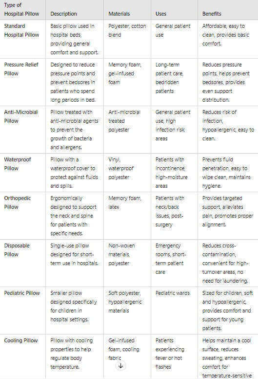 Hospital pillows offer comfort, support, and therapeutic benefits to aid in recovery and overall well-being. Below are some of the most popular pillow types for hospitals or healthcare settings:
